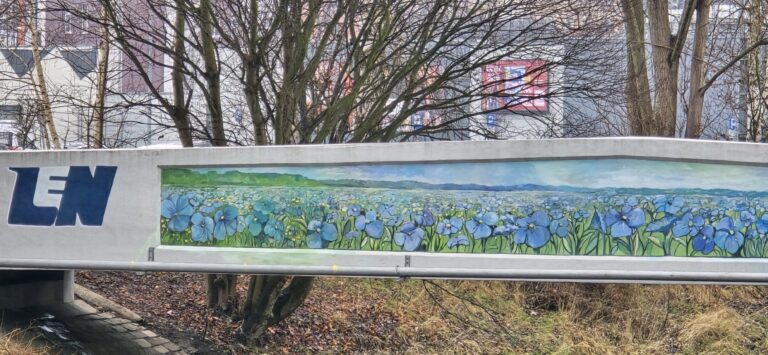 Dzieło na moście to nie tylko ozdoba przestrzeni publicznej, ale przede wszystkim hołd dla tradycji miasta – dla niebieskich łąk lnu, które niegdyś definiowały tożsamość Kamiennej Góry.