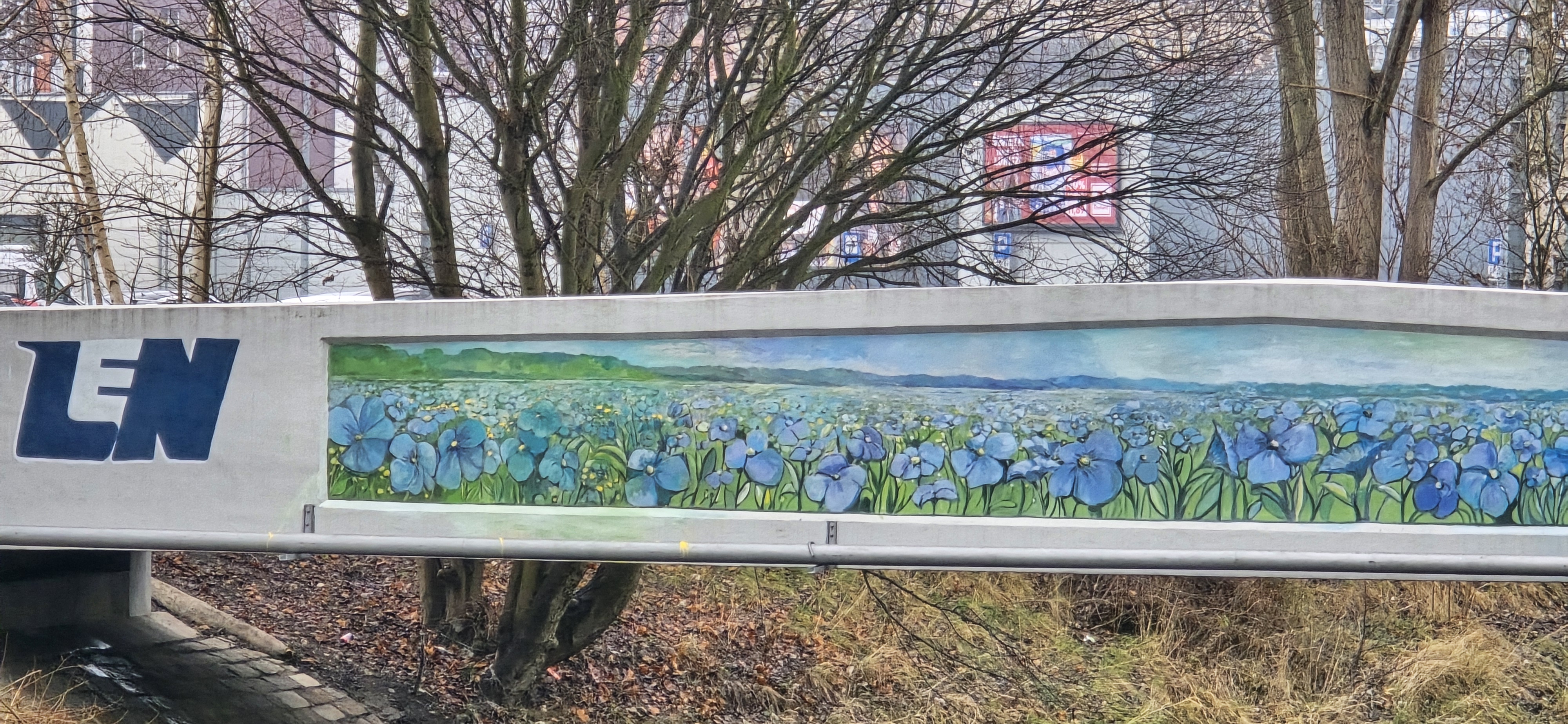 Latem 2025 roku na moście w centrum Kamiennej Góry powstało wyjątkowe dzieło artystyczne. Mural przedstawia pole kwitnącego lnu z logo firmy LEN, która przed laty działała w Kamiennej Górze.