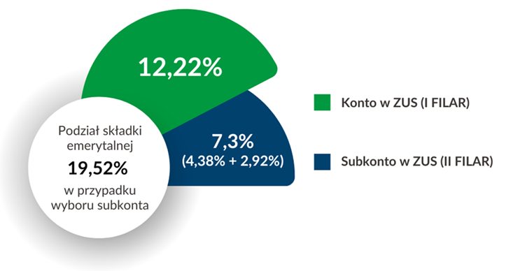 Przedmiotem decyzji osób ubezpieczonych jest, więc jedynie 2,92 proc. podstawy wymiaru składki, które może zostać zapisane na subkoncie w ZUS (I wariant) albo zostać przekazane do OFE (II wariant).