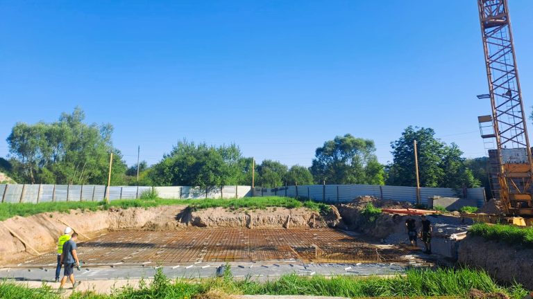 Po okresie przygotowawczym, ogradzaniu i organizacji placu budowy wykonawca zamyka roboty ziemne- wykonano podkład z chudego betonu, ułożono izolację poziomą pod płytą fundamentową, wykonano przegłębienie pod windę, trwa montaż zbrojenia płyty fundamentowej.